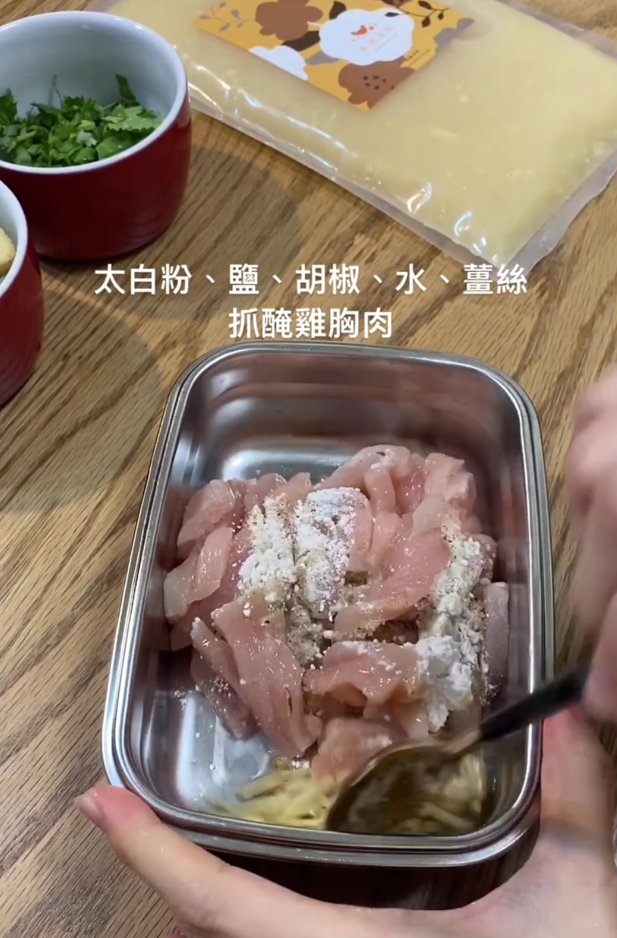 ➡️ 雞胸肉醃料📝食材: ▪️1大匙太白粉 ▪️1小匙鹽巴 ▪️1/2大匙蒜味胡椒粉 ▪️薑絲1大匙 ▪️水2大匙 |