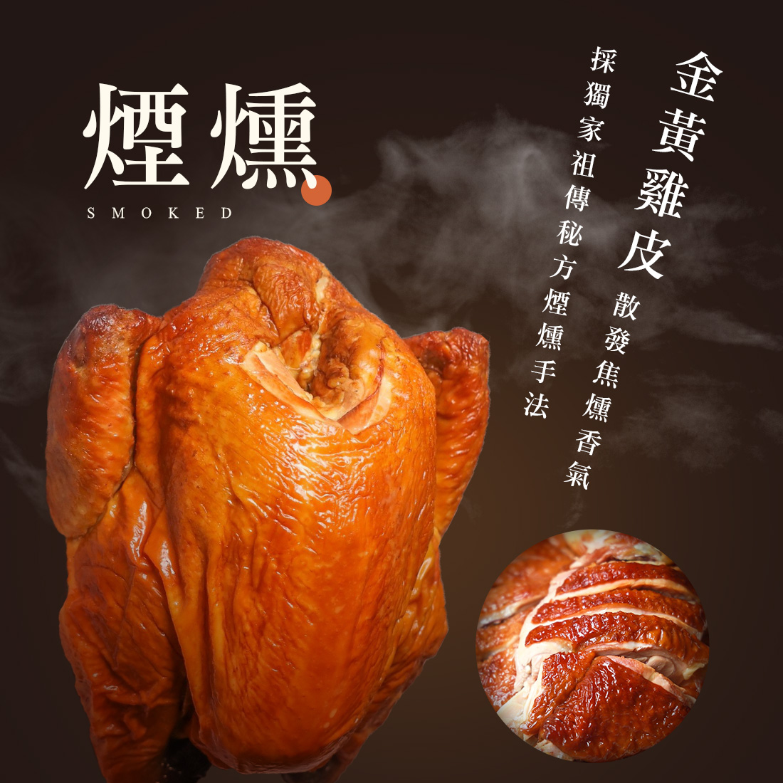✓ 採全雞祖傳秘製煙燻手法,金黃油亮散發焦燻香氣